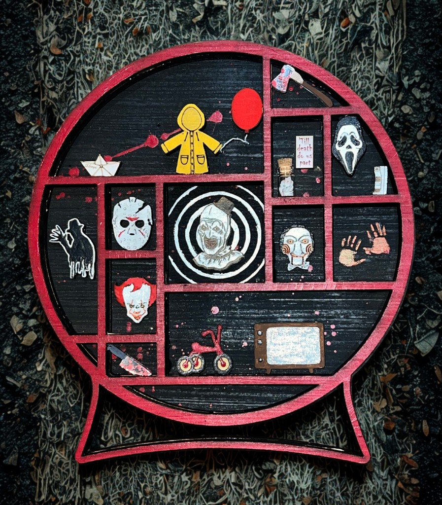 Bring a little spooky charm to your space with this handcrafted horror-themed mini bookshelf/shadow box. Each tiny detail is laser-cut and hand-painted, featuring iconic horror-inspired symbols arranged inside a bold circular frame. Perfect for horror fans, collectors, or anyone who loves unique, creepy décor. A fun mix of eerie and artistic made with care and just a splash of blood-red flair.